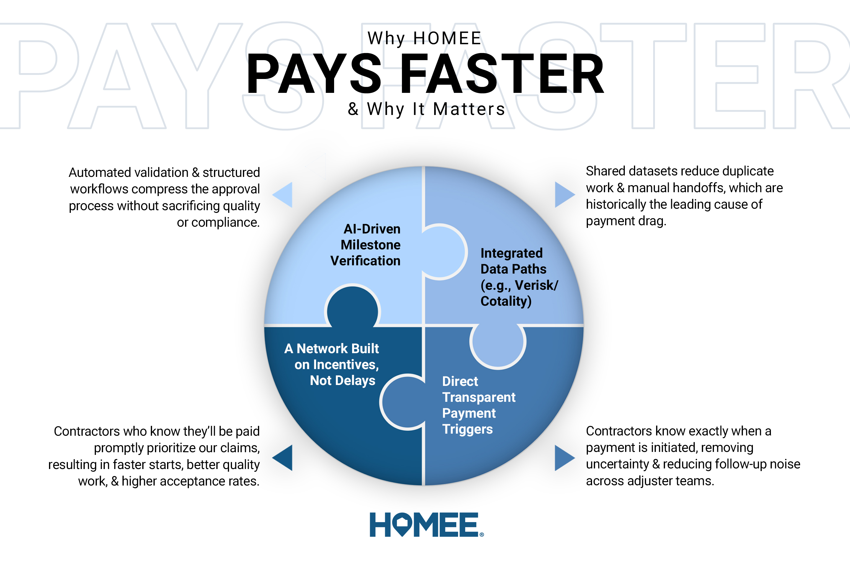 While the industry still frames “speed to pay” as a downstream operational metric, HOMEE treats it as a core piece of claims infrastructure. In a sector where delays compound at every phase of a claim, reducing contractor payment lag is one of the few interventions that simultaneously improves: